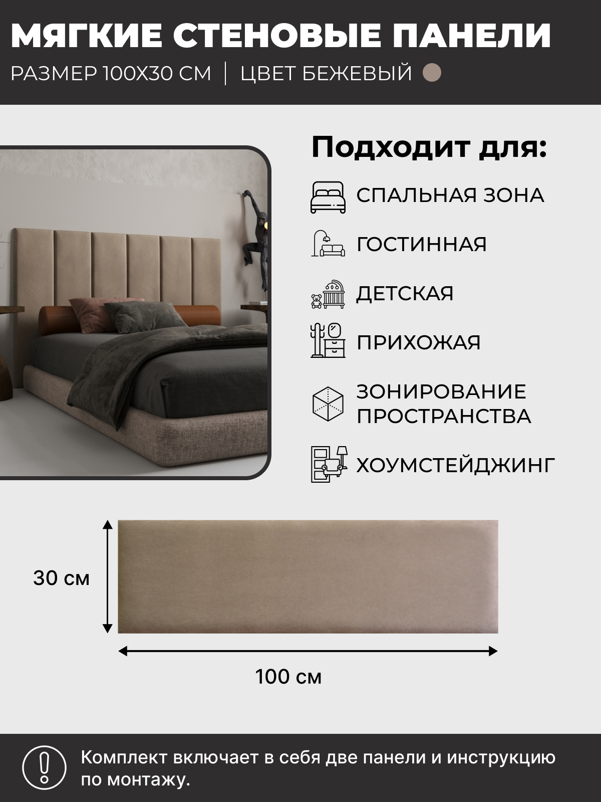 Мягкие стеновые панели, мягкое изголовье кровати 100х30 см, комплект 2 шт, цвет бежевый
