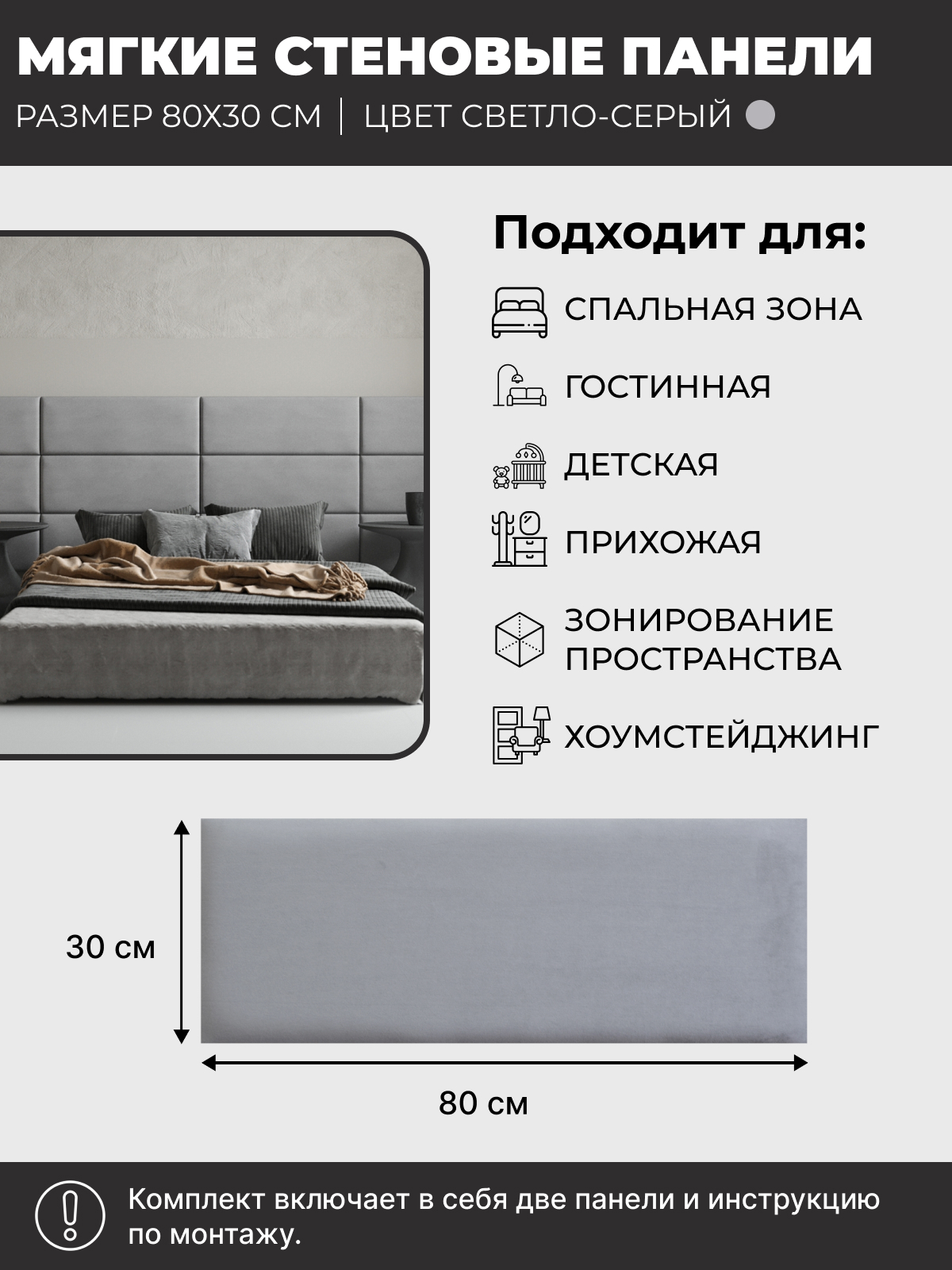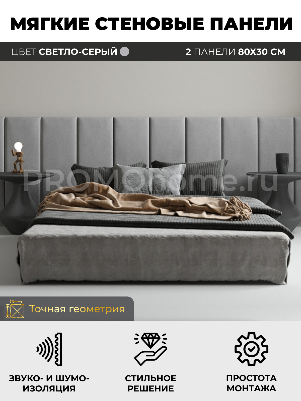 Мягкие стеновые панели, мягкое изголовье кровати 80х30 см, комплект 2 шт, цвет светло-серый