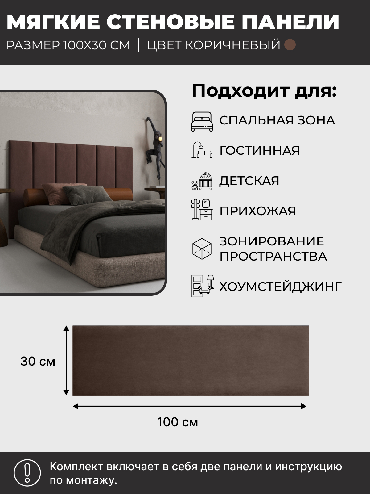 Мягкие стеновые панели, мягкое изголовье кровати 100х30 см, комплект 2 шт, цвет коричневый