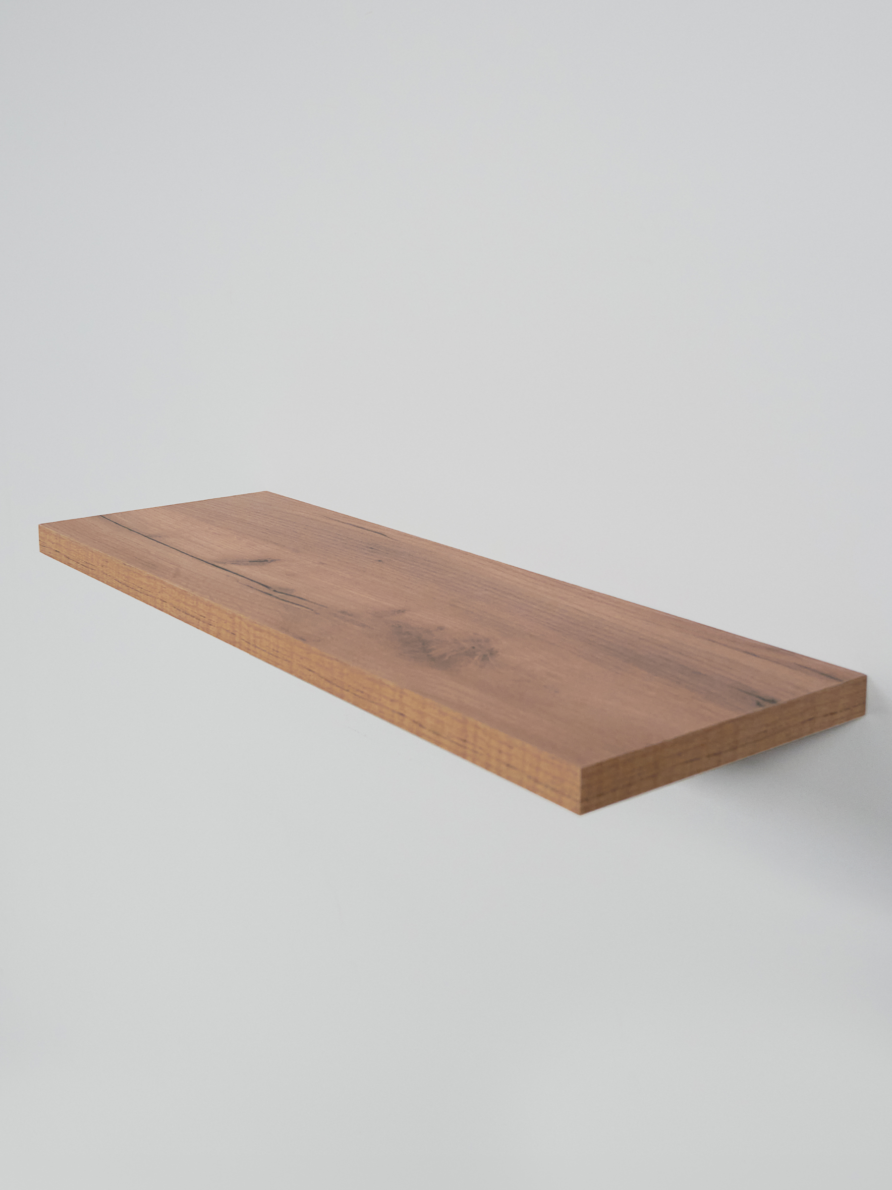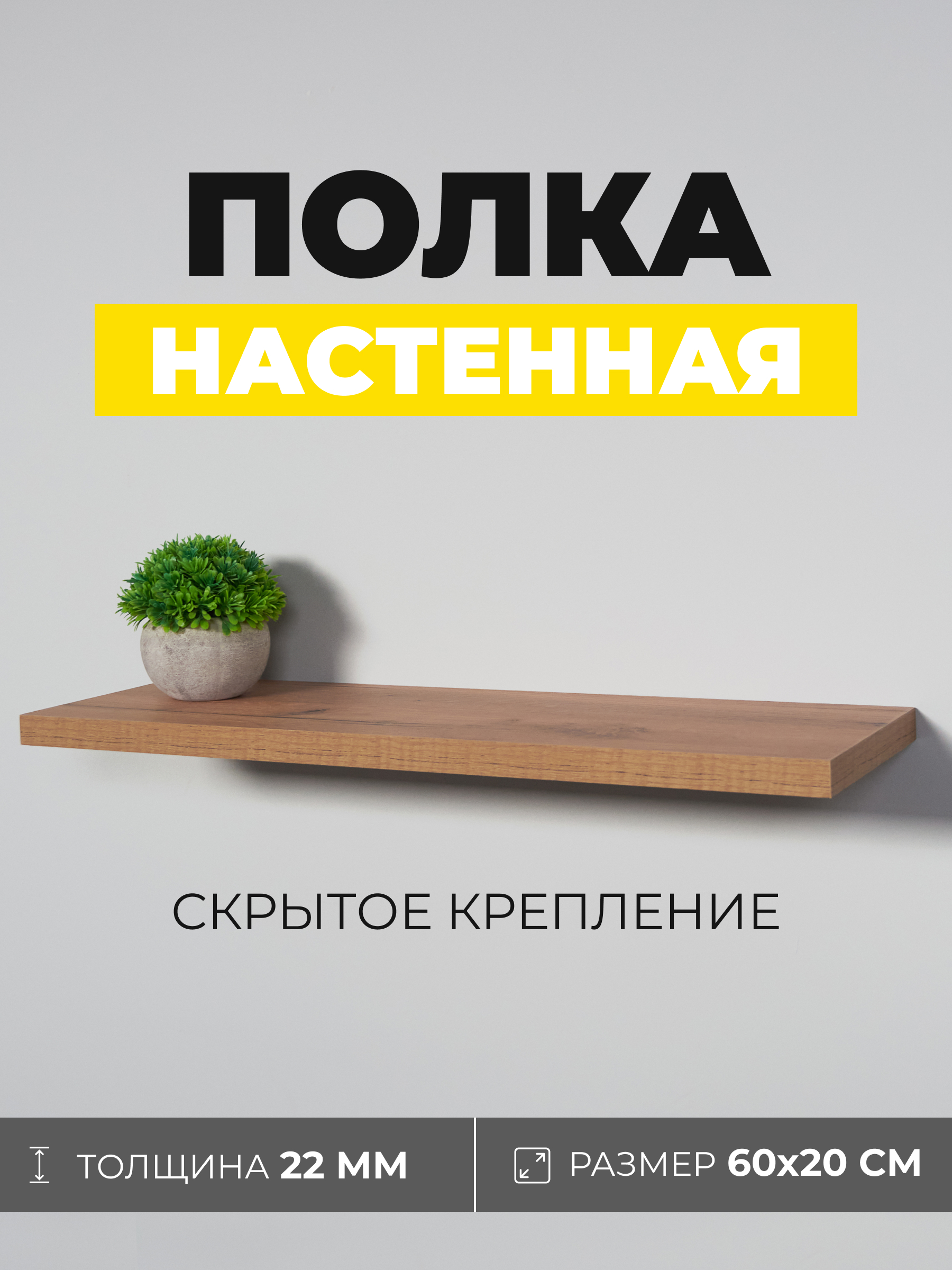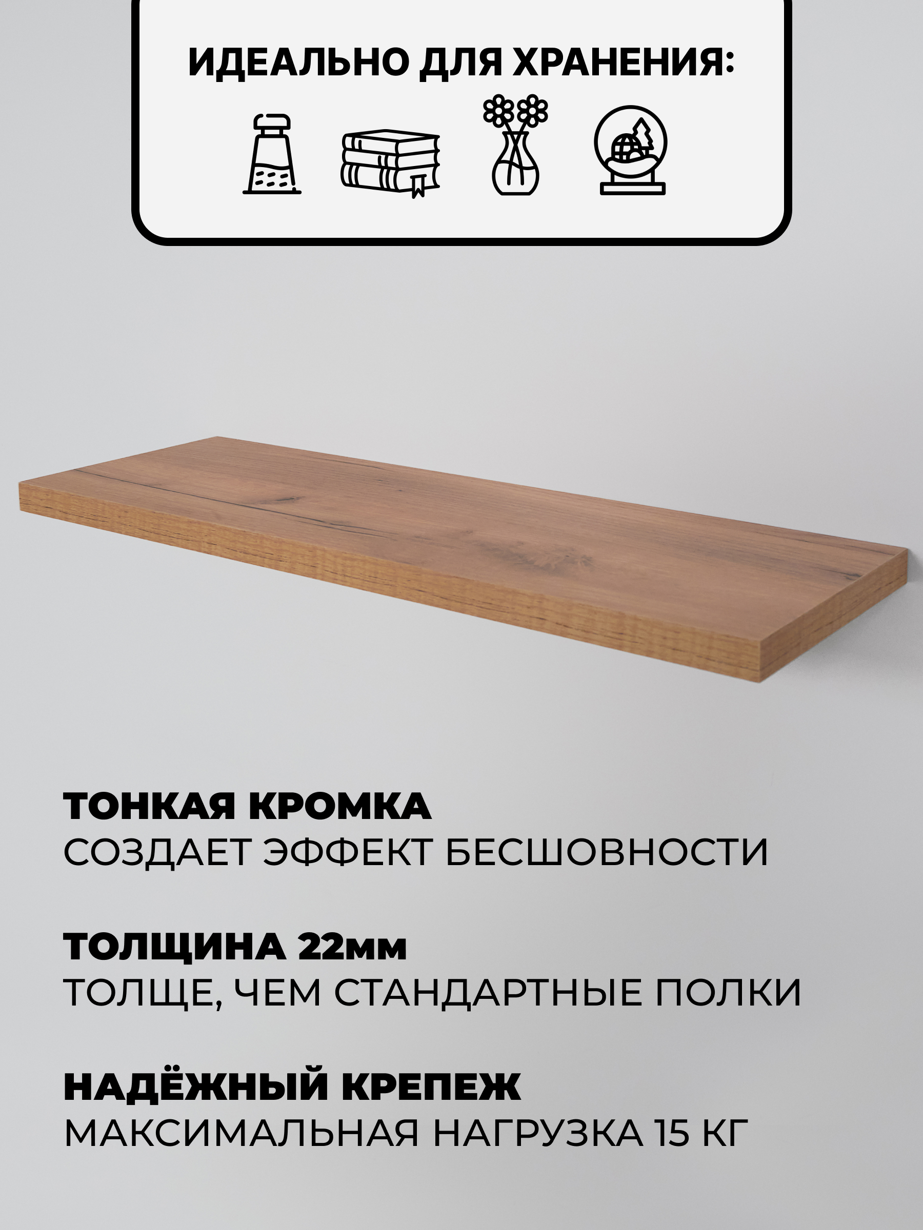 Компактная настенная полка со скрытым крепежом. За счёт невидимого монтажа и тонкой кромки создаётся эффект лёгкости — полка будто парит у стены. Подойдёт для книг, сувениров, косметики или любых мелочей, которые хочется держать под рукой.